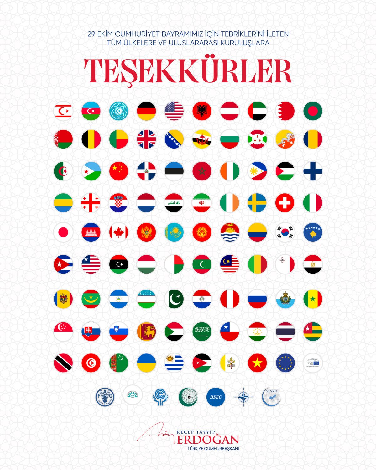 Erdoğan’ın paylaşımında tebriklerini ileten ülkelerin bayrakları ile uluslararası kuruluşların logoları da yer aldı.