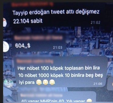Sözcü TV, barınak çalışanlarının kendi aralarındaki iç yazışmalara ulaştı. Burada çalışanların topladıkları köpek başına 10 TL kazanç sağladığı anlaşıldı. Kendi içlerinde yarış haline giren saha ekibinin, hamile köpekleri özellikle takip ettiği; gözü açılmamış veya doğmamış yavru başına dahi para aldığı anlaşıldı. Yazışmalarda yavrular için “Aramızda bölüşürüz” ifadesi kullanıldı. Bu paraların barınak yetkilisi Mehmet K.’nin eşi Cennet K. tarafından ödendiği dekontlara yansıdı.